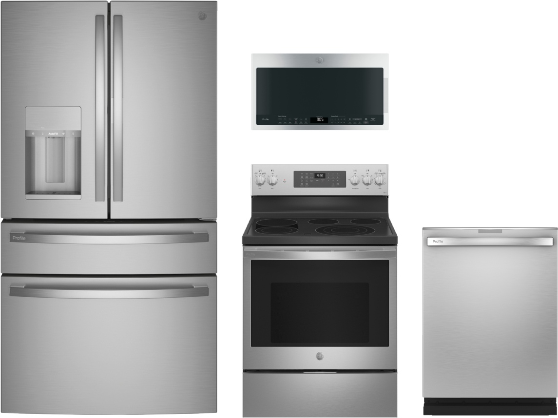 GE Profile™ 4 Piece Stainless Steel Kitchen Package with French Door Refrigerator, Freestanding Electric Range, Built In Dishwasher, and Over The Range Sensor Microwave.Read More