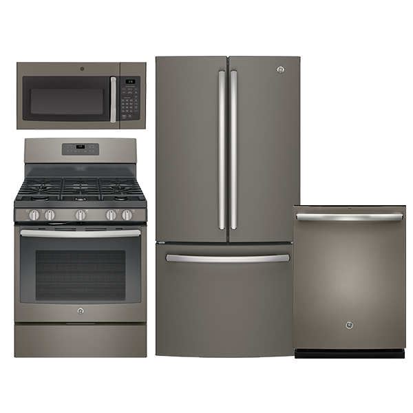 GE Slate Kitchen Package with French Door Bottom Mount Freezer Refrigerator, self clean gas range, over the range microwave and top control dishwasherRead More