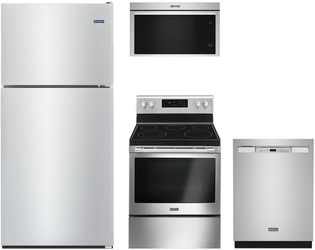 Maytag® 4 Piece Fingerprint Resistant Stainless Steel Kitchen Package with a top freezer refrigerator, over the range microwave, built in dishwasher and free standing electric range.Read More