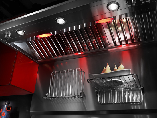 Backguard with shelf offers a sleek look with added convenience and flexibility. Shelf can be flipped down for use with food warming lamps (on select range hood models).Read More