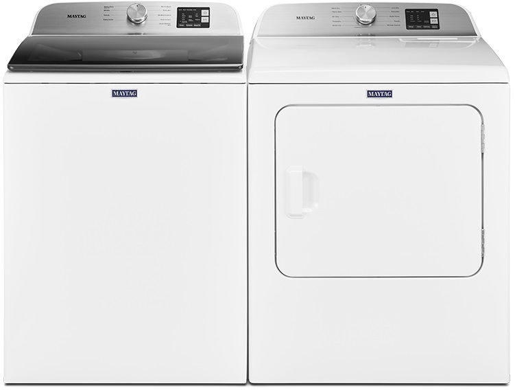 Maytag® White Laundry Pair with a 4.8 cu. ft. capacity top load washer and a 7.0 cu. ft. capacity front load electric dryer.Read More