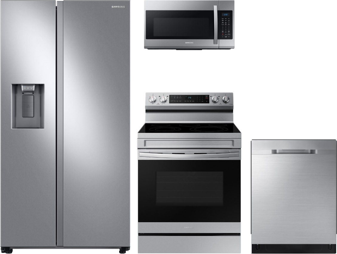 Samsung 4 Piece Kitchen Package-Stainless Steel with a side-by-side refrigerator, free standing electric range, built in dishwasher and over the range microwaveRead More