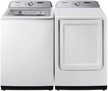 Samsung White Laundry Pair with a 4.9 cu. ft. capacity top load washer and a 7.4 cu. ft. capacity front load gas dryer.Read More